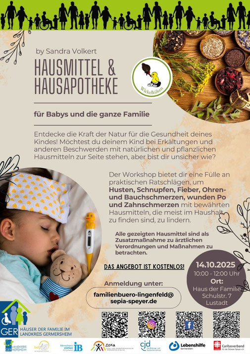 Der Workshop bietet dir eine Fülle an praktischen Ratschlägen, um Husten, Schnupfen, Fieber, Ohren- und Bauchschmerzen, wunden Po und Zahnschmerzen mit bewährten Hausmitteln, die meist im Haushalt zu finden sind, zu lindern.